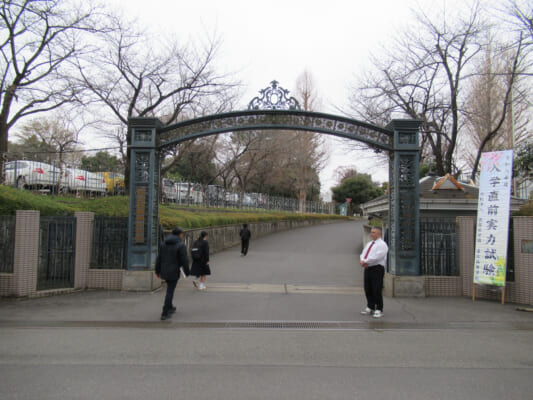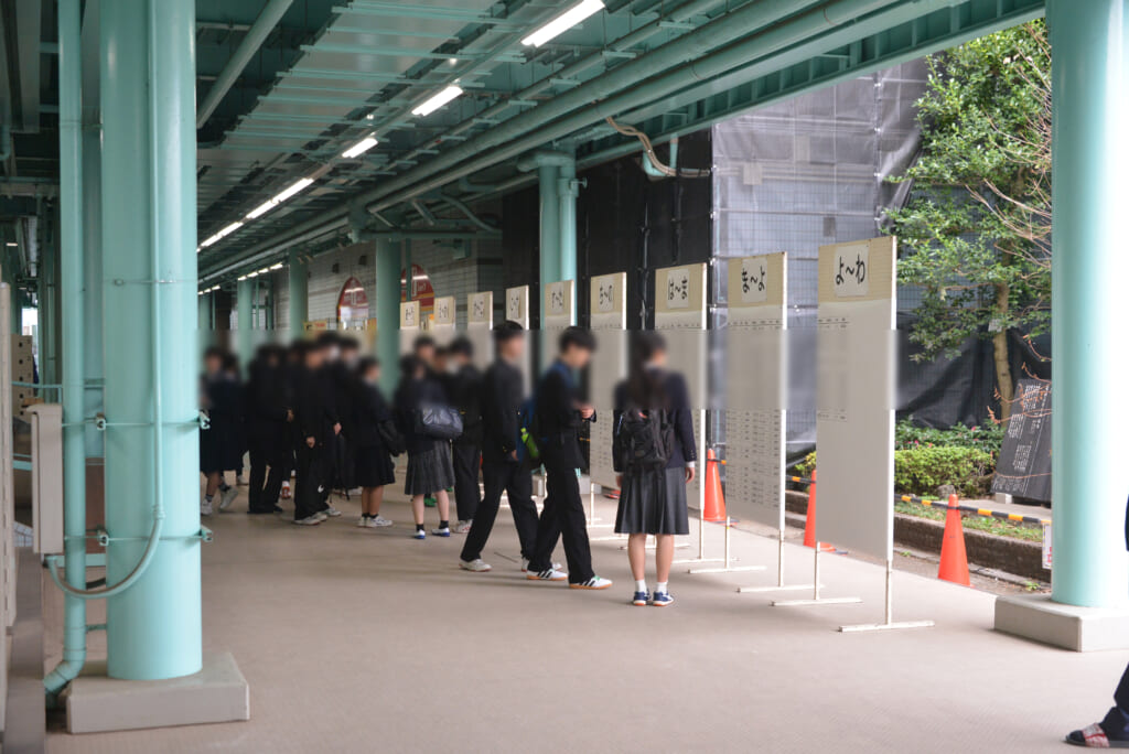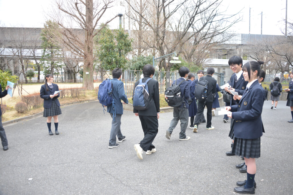 午前中の試験が終了し、校舎前では、在校生が部活動のご案内、ダンス部の自主公演と吹奏楽部の定期演奏会のお知らせチラシと入場チケットが